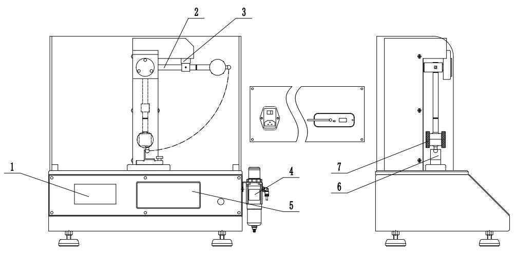 1-打印機(jī) 2-3-鎖緊裝置 4-調(diào)壓閥 5-顯示屏 6-金屬平砧 7-配重塊